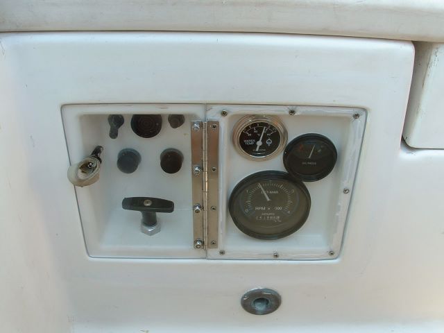 | Finally, from behind the helm the panel looks like this. I can see enough of the needles to know that the engine is running at nominal. The oil pressure looks like a little white tick mark on the picture, but it is really pretty easy to see. If it falls low, it is very easy to see. The biggest problem that I encountered was that I made the mold on a perfectly flat board. In fact the side of the cockpit is not flat. It caused me a great deal of work to try and get the flat panel to fair in with the cockpit. If I had to do it over I would make a mold of the side of the cockpit and add the wood pieces to that to make the mold for the panel. |