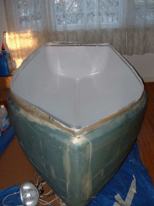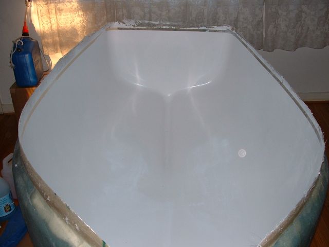 | After the plug is waxed, a layer of white gelcoat was sprayed on the mold and a number of layers of glass were applied. |