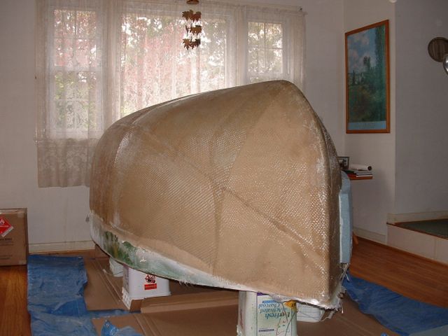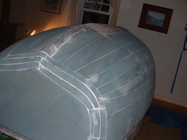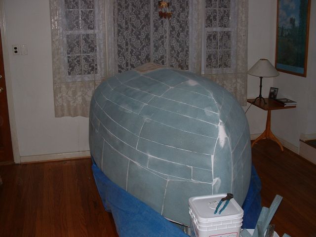 | I heat formed 2 inch PVC foam and glued it to the layer of glass. The entire shell was then rough sanded. |