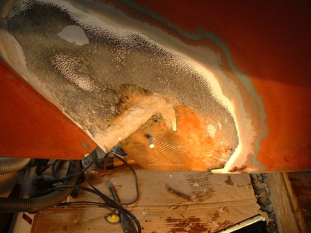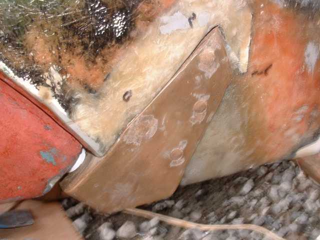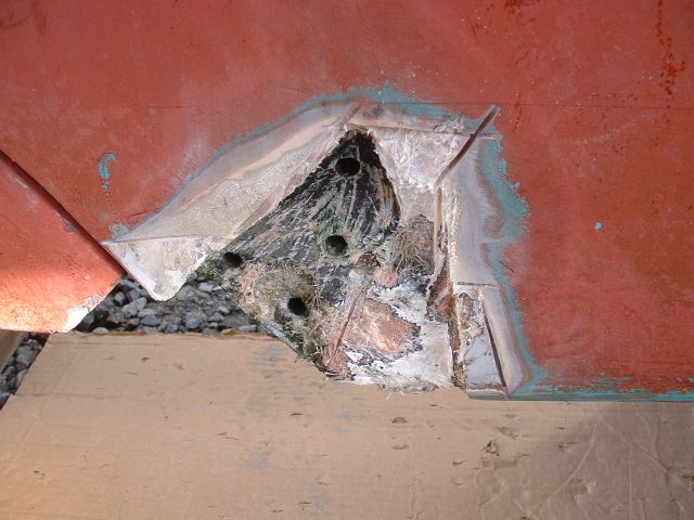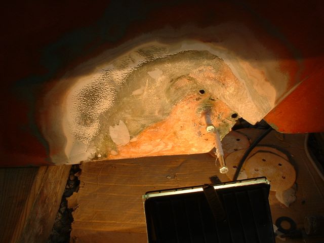 | With the pins removed and then the shoe removed it looks like this. There was some punky glass around one of the pins so I had to grind it out to re-build solid laminate. |