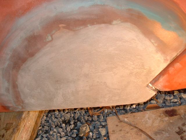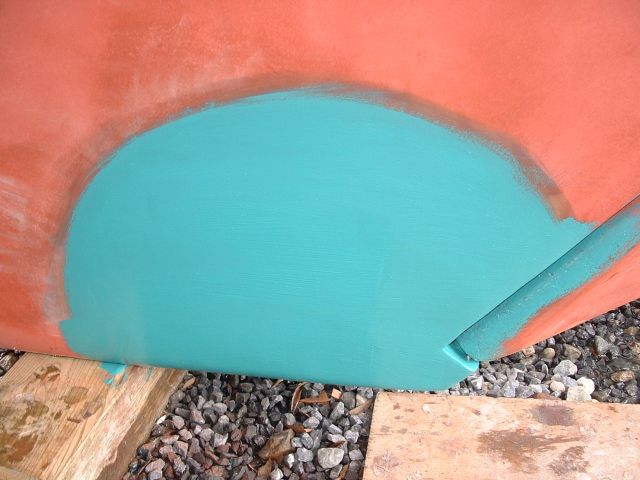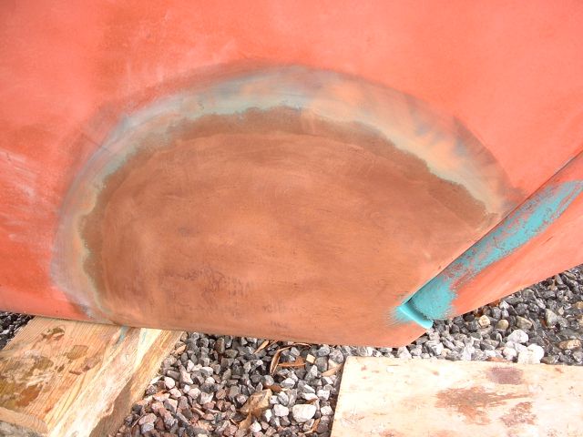 | Two layers of copper powder and epoxy mix to (hopefully) prevent barnacles if the paint is worn off. Again, a little sanding. |
