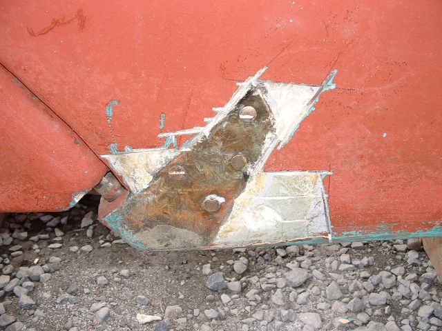 | the pins were peened into the chamfered holes and ground flush. Next comes the glassing in the keel around the shoe. A snug glassing in can provide for a great deal of support so there is redundancy with the pins. |