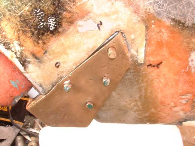 | The keel was built up with glass to form a reasonably snug fit to the shoe. The pintle was wrapped in a layer of plumbers teflon tape to provide a release surface in the event that some epoxy found it's way up there during the mounting. A layer of sealer was placed between the shoe and keel and bronze pins were inserted. |